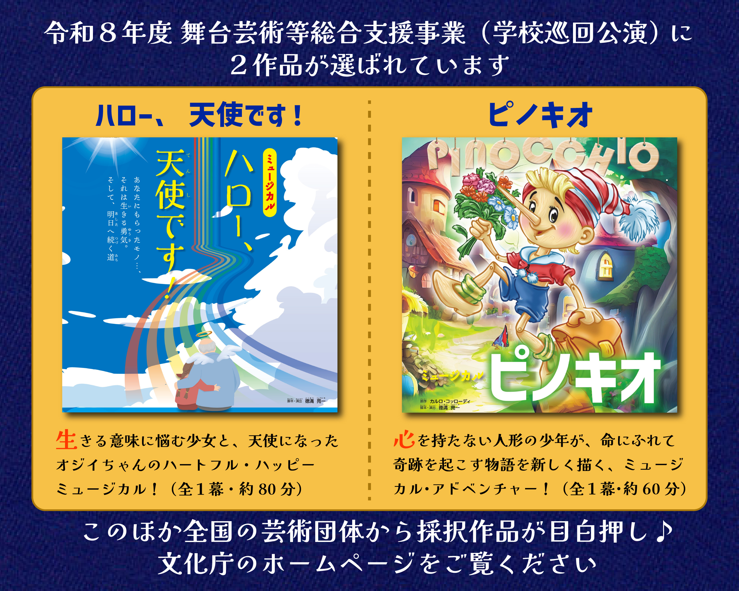 文化庁主催 「令和8年度 学校巡回公演事業」に『ハロー、天使です!』『ピノキオ』が採択されました。